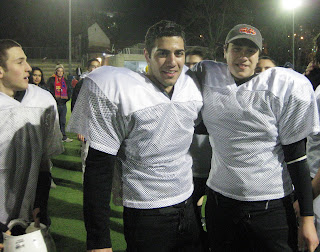 This post will honor the young football heroes. They are heroes to me -- not because they are brave and fearless and stupid. ("Please, Coach! Send me in there to defend a cylindrical object from several gigantic guys, so that they can all land on me with their full weight as they try to pry the ball from my frozen and possibly bleeding fingers!" Football is a game that only a few very special women can truly understand. I am not among this elite group.) These young men are my heroes because even under fire, they remember who they are, and what they stand for.